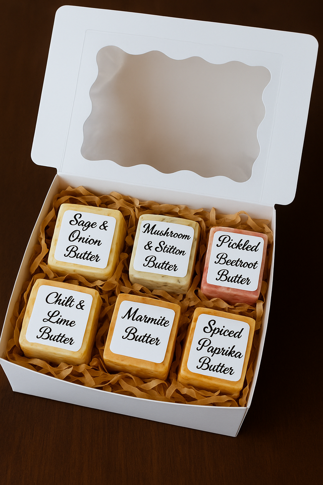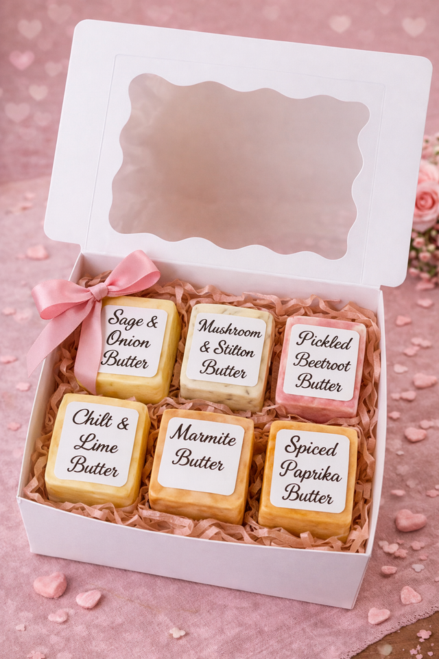 Treat someone special (or yourself!) to a handpicked box of six artisan butter cubes, chosen from our unique range of savoury flavours.
