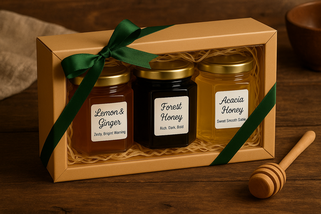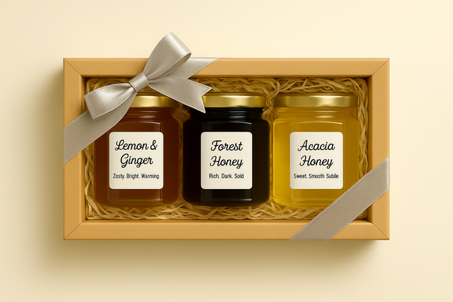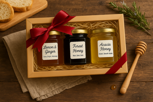A thoughtful gift for honey lovers. This hamper includes three artisan honeys of your choice, beautifully presented with two wooden honey dippers for easy drizzling. Each jar is handcrafted in small batches, made with all-natural ingredients, and bursting with flavour — from floral and delicate to bold and earthy. Presented in a "ready to give" gift box, it’s a sweet treat that suits every occasion.
