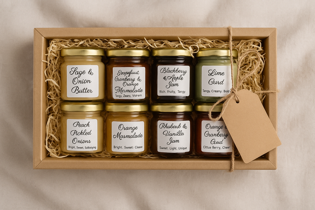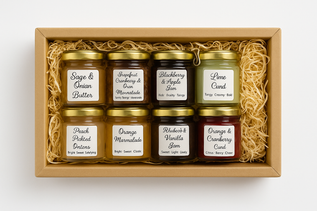 The perfect introduction to Buxton Preserves & Butters, this hamper includes eight artisan jars, Hand chosen from across our full range by you. From butters and honeys to jams, curds, pickles, and chutneys, it’s a true taster experience of our handcrafted creations.