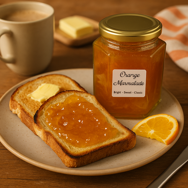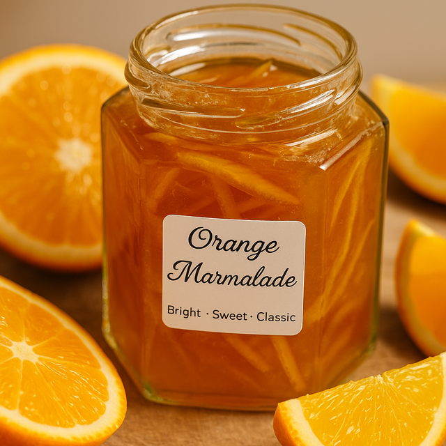 Bright, zesty, and perfectly balanced — our traditional Orange Marmalade is handmade in small batches for a true taste of sunshine in a jar. We use juicy, ripe oranges to create a preserve that combines a tangy citrus bite with a smooth sweetness, finished with delicate shreds of peel for that classic marmalade texture.