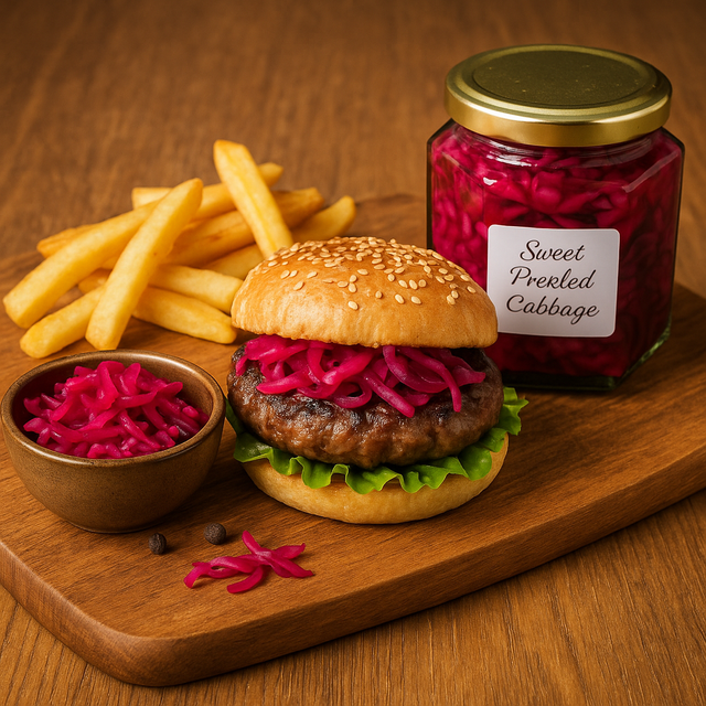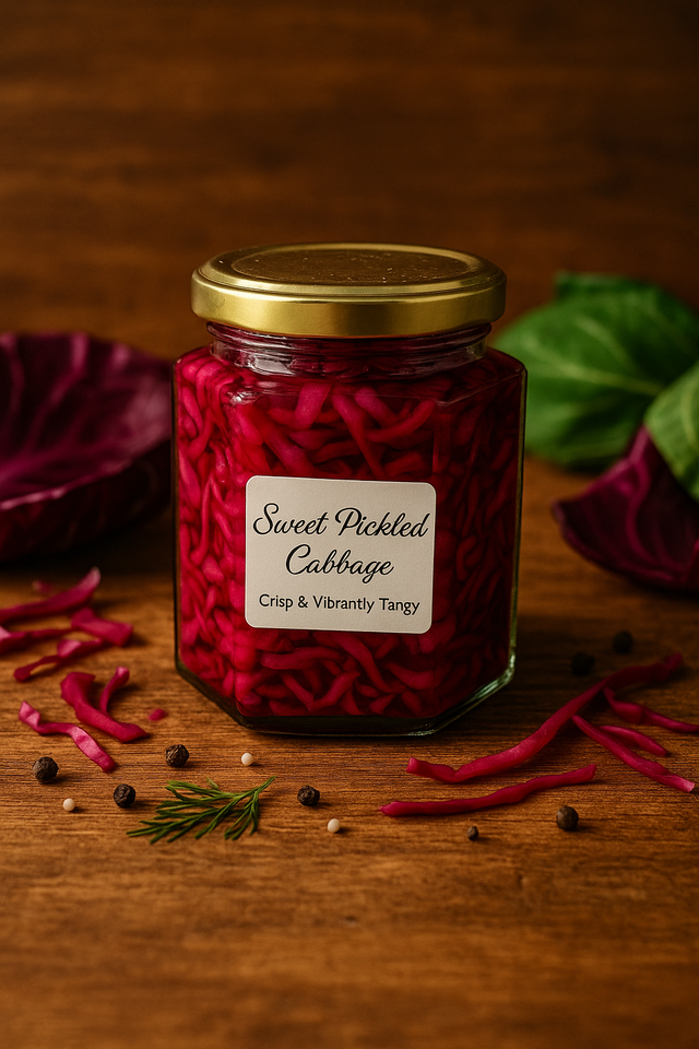 Crisp, colourful, and full of flavour, our Sweet Pickled Cabbage is the perfect balance of tangy and sweet. Hand-prepared in small batches, it brings a vibrant crunch to every meal. Enjoy it with sandwiches, burgers, salads, or alongside your favourite cheese and cold meats — a versatile pickle that brightens up any plate.
