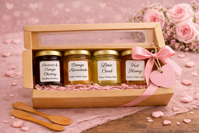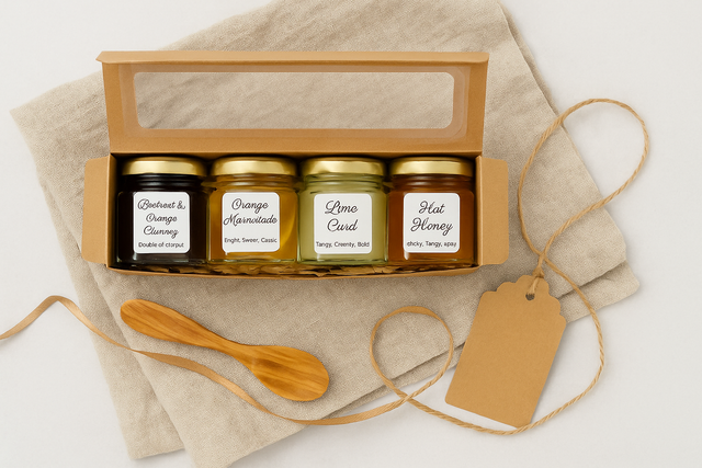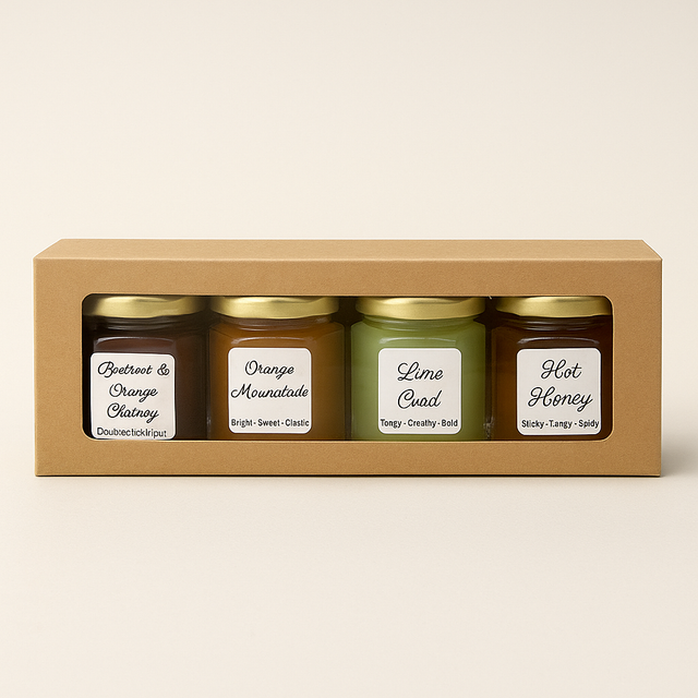 A charming way to sample our range, this set of four mini jars lets you choose from jams, curds, honeys, pickles, chutneys, or butters. Perfect for gifting, party favours, or simply discovering new flavours, each jar is a little taste of handcrafted heritage.